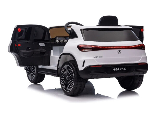 Mercedes-Benz EQA 250, muziekmodule, leren stoel, EVA rubberbanden (XMX625) Vermogen/accu: 12 volt 7Ah accu Motor: 4x 12 volt 25 watt motoren, een motor op elk wiel Rijden: 3 instelbare snelheden tot 5 km per uur, rijdt zowel vooruit als achteruit met ‘soft start’, werkt met het gaspedaal en met de afstandsbediening, elektronische rem wanneer het gaspedaal wordt losgelaten Verlichting: Led-verlichting: koplampen en achterlichten Muziek / Multimedia: Startmotorgeluid, claxon en muziekknoppen, muziekmodule met stories, MP3-, USB-ingang en Bluetooth om je eigen muziek af te spelen, volume is regelbaar, accu-indicator Bijzonderheden: 2 deuren, rubberen EVA banden, kunstlederen stoel met veiligheidsgordel, achterwielen geveerd, hoogglans gelakt Afstandsbediening: 2,4 GHz afstandsbediening met instelbare snelheden en pauzeknop Opladen & speeltijd: 8 uur opladen, 60-90 minuten speeltijd op een vlakke weg Inbegrepen: Afstandsbediening, batterij en oplader Aantal zitplaatsen: 1 zitplaats Geschiktheid: Voor kinderen tot 5 jaar tot 30 kg Afmetingen product: 111,5 x 69 x 52,5 cm ( lengte x breedte x hoogte ) Afmetingen verpakking: 115 x 63 x 33 cm ( lengte x breedte x hoogte ) Let op: als gevolg van het fabricageproces kunnen er vlekken, krassen, stippen of schrammen op het elektrische speelgoed zitten. Soms zijn onderdelen niet 100% naad-op-naad afgewerkt. Dit komt vaak voor en geldt voor alle modellen, ongeacht waar je ze koopt.